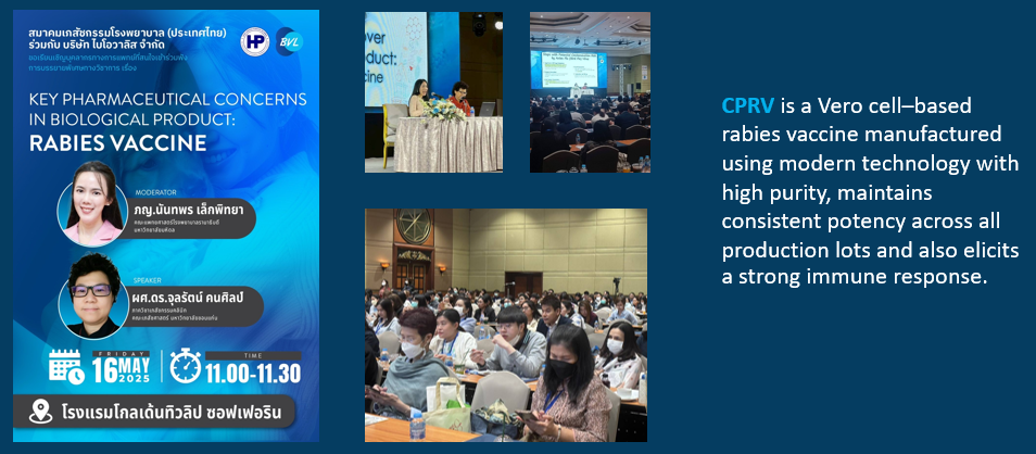 Biovalys was honored to welcome Moderator, Pharmacist. Nantaporn Lekpittaya and Speaker, Asst. Prof. Dr. Julraht Konsil, Ph.D., who kindly shared expert insights on key pharmaceutical considerations for rabies vaccination. She also provided valuable clinical and practical updates on the Chromatographically Purified Vero Cell Rabies Vaccine (CPRV), including its benefits in real-world practice. This session supported meaningful knowledge exchange and reinforced Biovalys’ commitment to advancing disease prevention through evidence-based information and collaboration with the pharmacist community.
