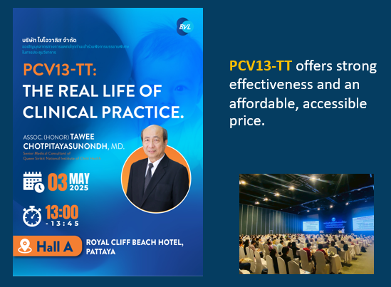 Symposium 1 was honored by Assoc. (Honor). Prof. Tawee Chotpitayasunondh, M.D., who provided an epidemiology update on Streptococcus pneumoniae and shared clinical updates on the 13-valent pneumococcal conjugate vaccine (PCV13-TT).
